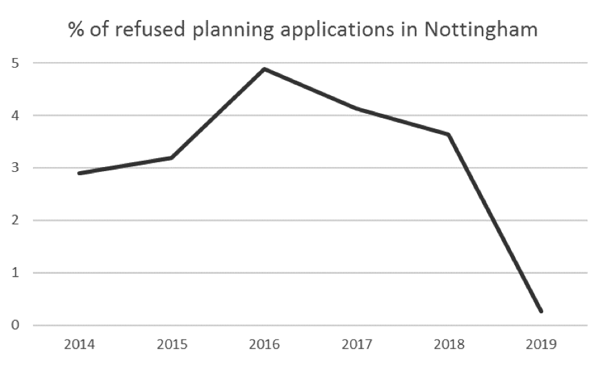 Percentage of refused planning applications in Nottingham between 2013 and 2019.