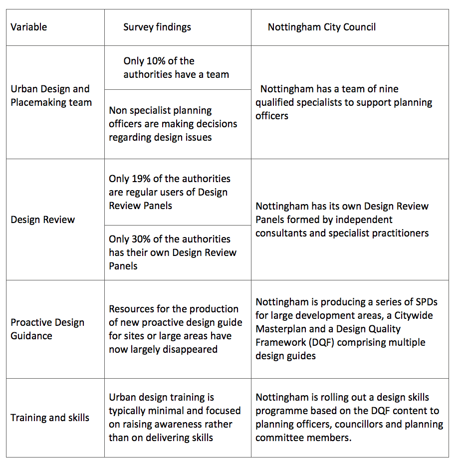 In 2017, the Urban Design Group and the Place Alliance conducted a survey of Design Skills in English Local Authorities and Nottingham City Council took part in this survey. The survey measured 4 key themes: Change over time; In-house capacity; Design review; Design guidance and training. The table below shows the average results of the study in comparison to Nottingham City Council’s service.